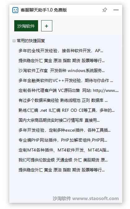 客服聊天助手,聊天快捷回复助手,常用短语管理系统 软件语言:简体中文 软件大小:582KB 运行环境:Windows 所有系统 .Net 4.0环境 访问人气:17316 更新时间:2025/6/1 11:34:29 请解压缩后使用 暂无下载 软件信息 更新日志 简介 以前QQ那个快捷回复挺好用的,后来QQ9后就没有这功能,所以我们开发个客服聊天助手软件。可用于常用短语管理,操作快捷简单方便。 程序截图 出售定制软件源码,详细联系客服。